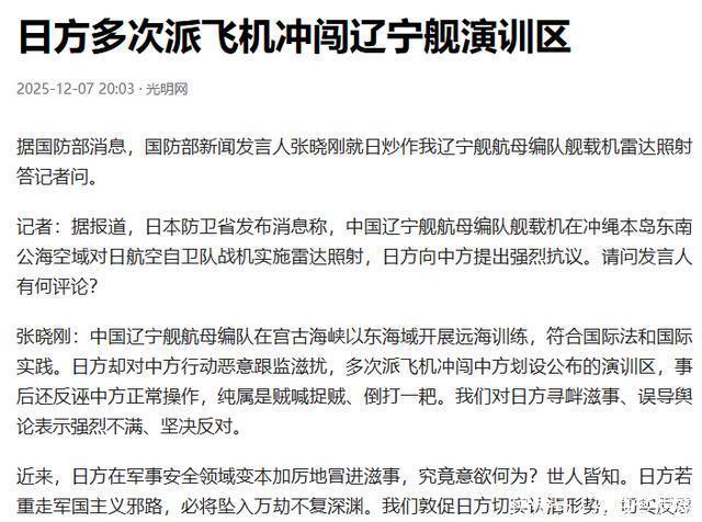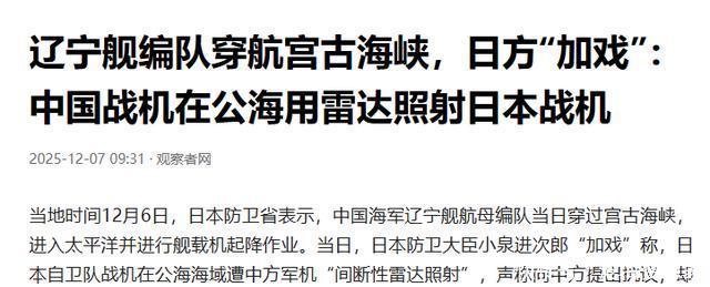 而且,我方海军编队里还有055型万吨驱逐舰、052D、901补给舰等,构成完整作战体系。 这样的场面,不仅象征着我国海军的成熟,也标志着我们保护海洋利益的能力进入新阶段。 而日本的紧张正源于此。 一个曾经在海上“独霸西太”的岛国,忽然发现邻国的航母编队能自由穿越宫古海峡,在第一岛链外自在训练,自然坐立不安。 而从历史的角度看,日本每次军事扩张前,都少不了类似的“舆论铺垫”。 1931年“柳条湖事件”是假炸铁轨,如今的“雷达照射事件”,是假装被锁定。 手法变了,逻辑没变。 区别只是,这一次,我们不再是被动挨骂的“沉默者”,而是敢于亮出底线、敢于说“不”的大国力量。 从空中对峙到外交交锋,这场“雷达照射”风波看似突发,实则是日本“挑衅—炒作—抹黑”套路的延续。 它的目的,不是为了和平,而是为了军费、选票和战略焦虑。 而我们的应对,则体现出成熟大国的自信与节制——既不被带节奏,也不退让半步。 风浪再大,航向不偏。 参考文献: 辽宁舰编队穿航宫古海峡,日方“加戏”:中国战机在公海用雷达照射,观察者网,2025-12-07 日本自卫队战机紧急起飞越发频繁,且集中在冲绳方向,红星新闻,2025-12-08 日方炒作“雷达照射”颠倒黑白包藏祸心,解放军报,2025-12-09 中国海军训练,不会纵容日本碰瓷,环球时报,2025-12-08