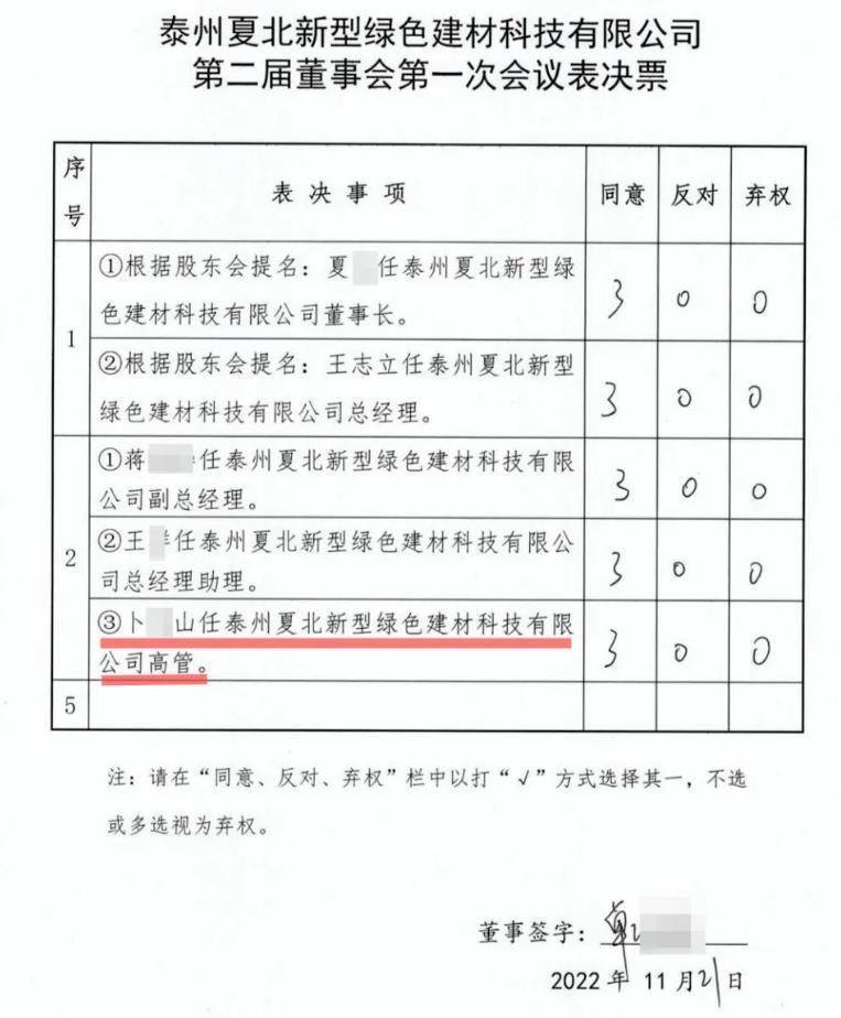 夏北公司第二届董事会第一次会议表决通过任命卜某山为夏北公司“高管”(图源:红星新闻)